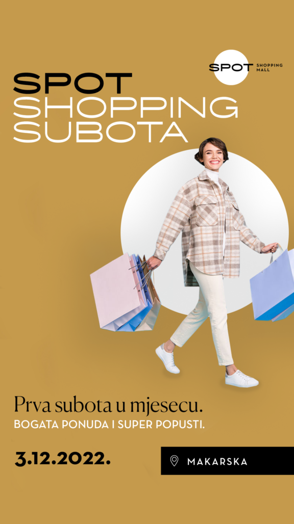 Vrijeme za prvi blagdanski shopping jer prva subota u mjesecu rezervirana je za SPOT Shopping Subotu! Dan odličnih pogodnosti kada Vas darujemo atraktivnim popustima i super cijenama. Pripremili smo posebne pogodnosti za jedinstven doživljaj kupovine, odlična druženja i još bolji shopping.
